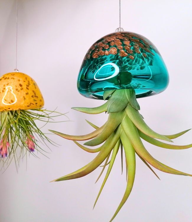 Una scultura in vetro soffiato a forma di medusa, che ospita una tillandsia.
