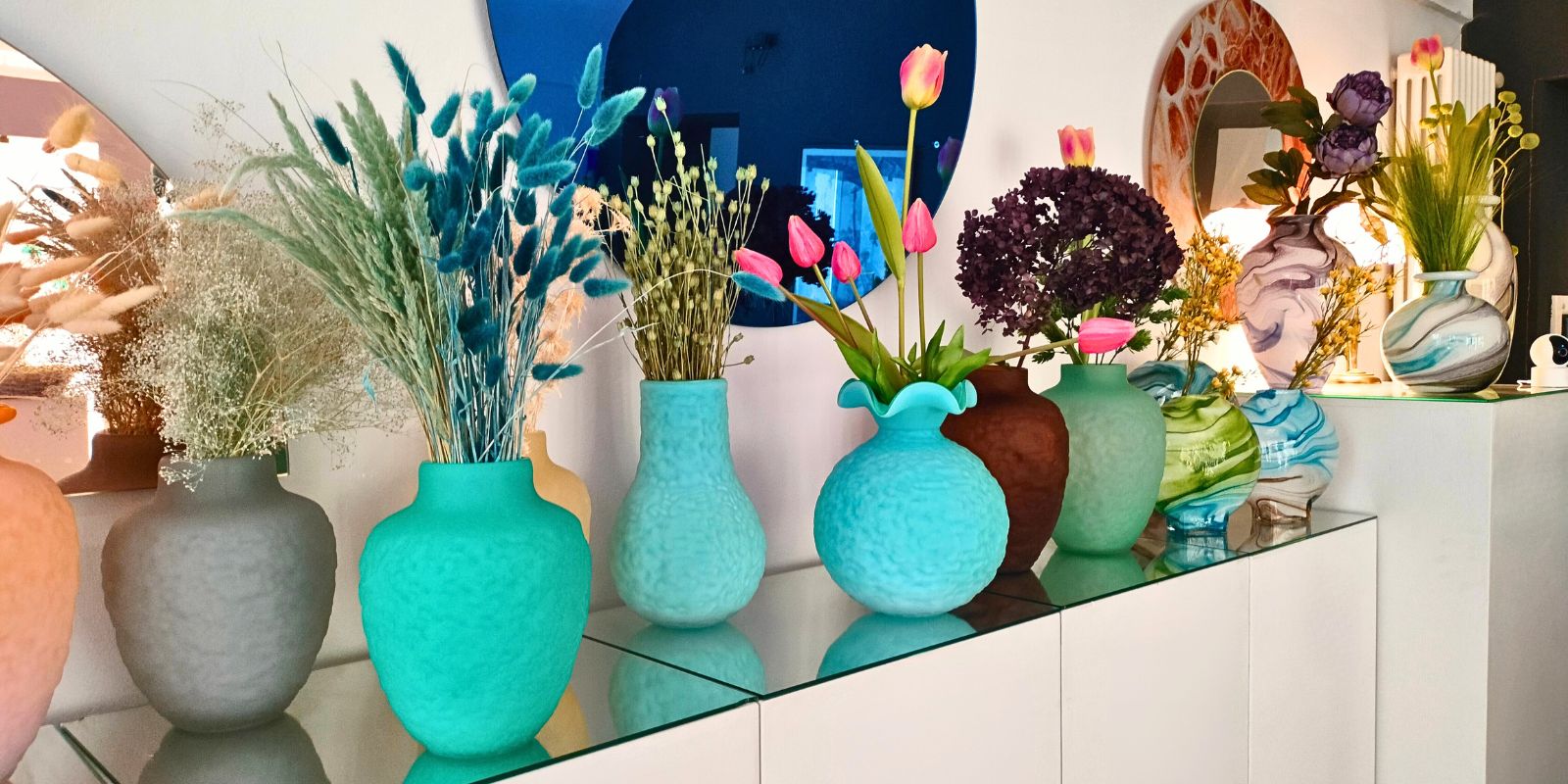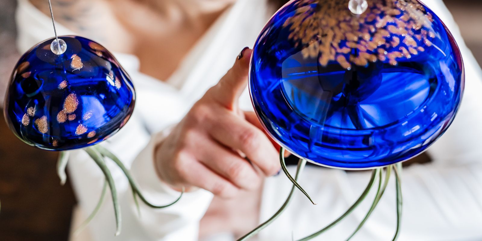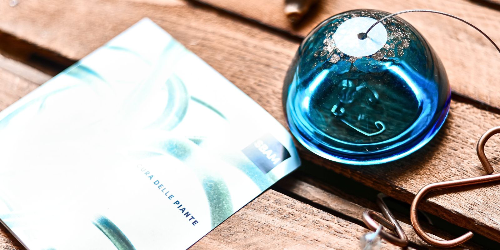 Le screziature metalliche sul vetro soffiato verde danno luminosità e movimento.