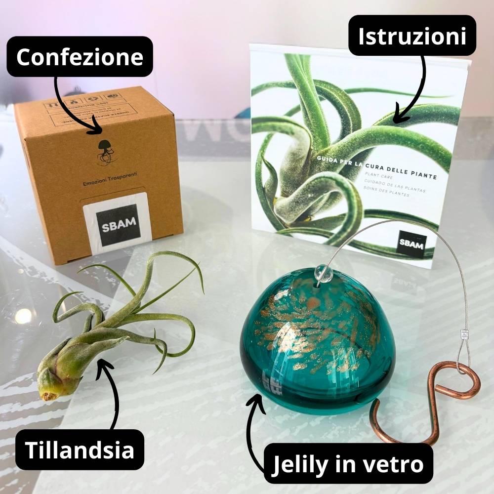 Ricevendo la JELILY - Porta pianta aerea troverai il necessario per appenderla e prendertene cura. All’interno della confezione, troverai Una Tillandsia Caput Medusae Large. La JELILY - Porta pianta aerea è cablate con cavo e gancio, pronta per essere appesa. Per aiutarti a mantenere la tua Tillandsia troverai anche dettagliate istruzioni per la cura della piantina.