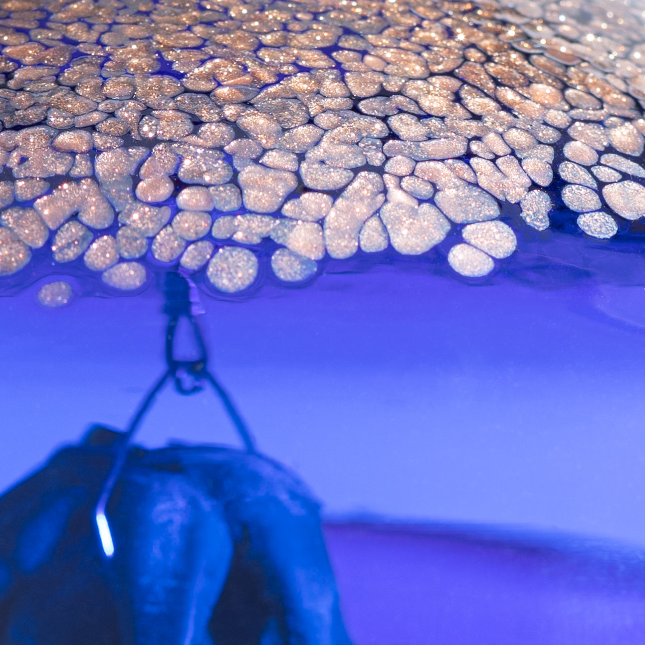 Una scultura in vetro soffiato a forma di medusa, che ospita una tillandsia.